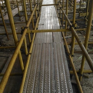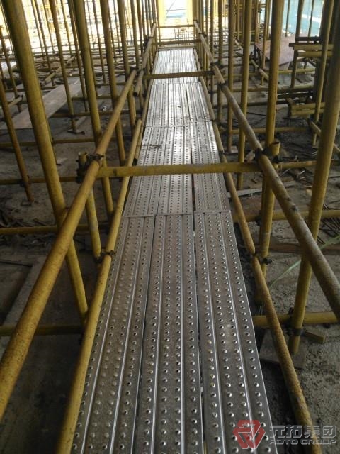 規(guī)格相同的腳手板,木跳板的重量是鋼制腳手板的1.5-2倍重量,而且雨天木板吸水后更笨重,且極端不防滑。工人搭架施工時,木板須2人抬運,而我公司生產(chǎn)的鋼跳板一人可拿2-4片,極大的提高了工作效率,高強(qiáng)度性使得腳手架管的數(shù)量也能減少使用。