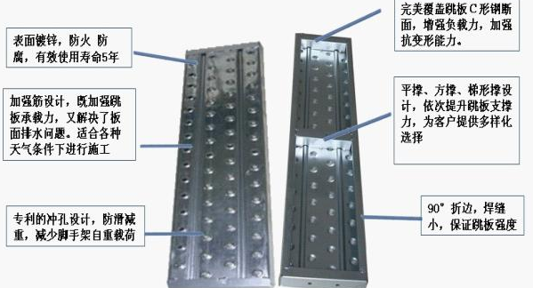 有橢圓沖孔設(shè)的鋼跳板可以讓產(chǎn)品本身減重,易排積水,同時(shí)增加磨擦力使防滑的效果倍佳.